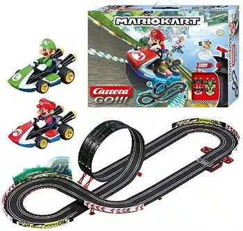Avis général. Si nous recommandons le Carrera Mario Kart Carrera Go, c’est entre autres parce qu’il multiplie les défis pour garantir des courses palpitantes. Ce circuit électrique avec voitures miniatures Mario et Luigi offre plein de défis : virages serrés ou relevés, looping, lignes droites à grande vitesse, rétrécissement et croisement…